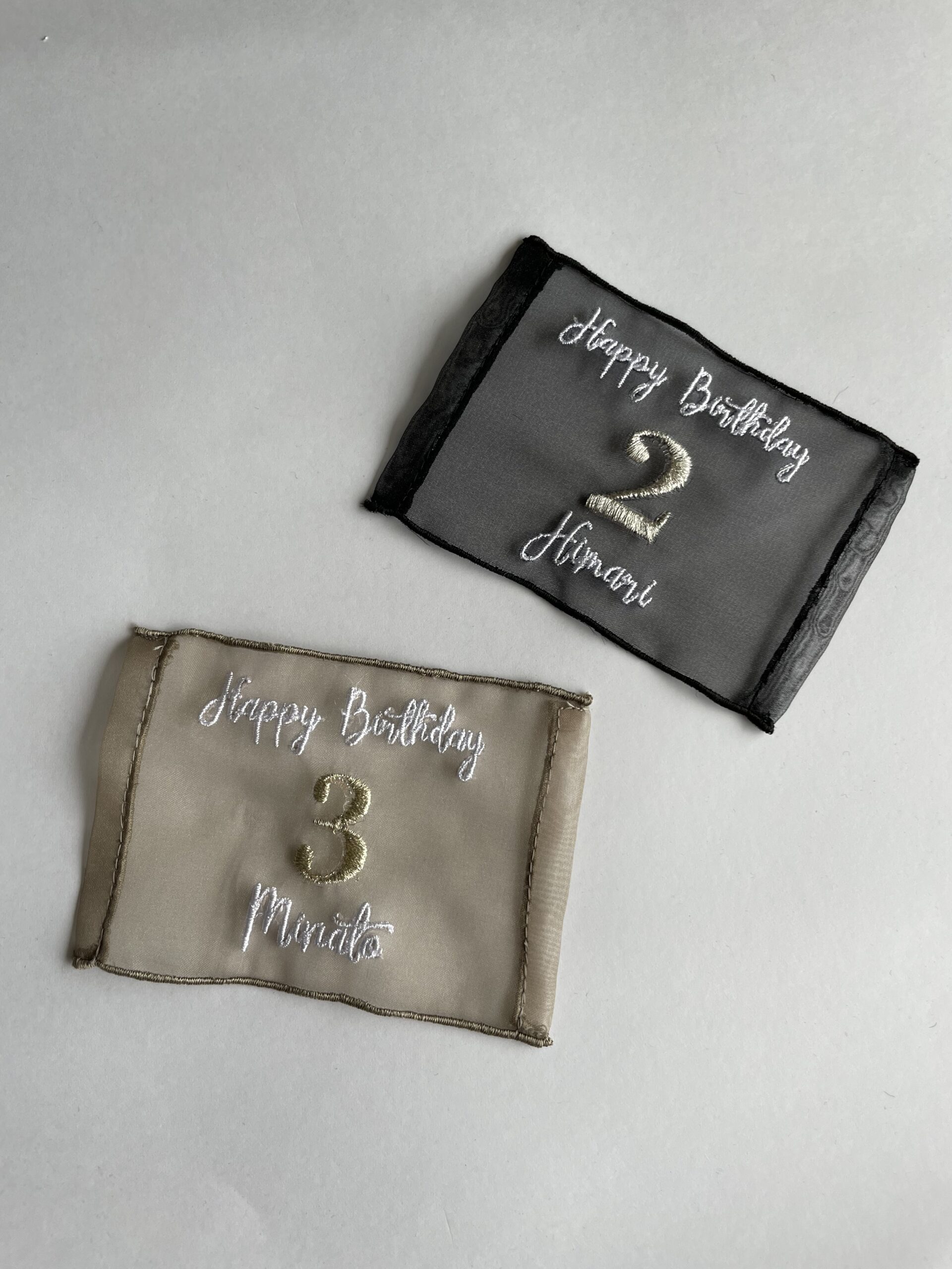 - 𓅷透け感のあるオーガンジー生地にHappy Birthdayとお名前の刺繍が入ったケーキトッパー𓅷